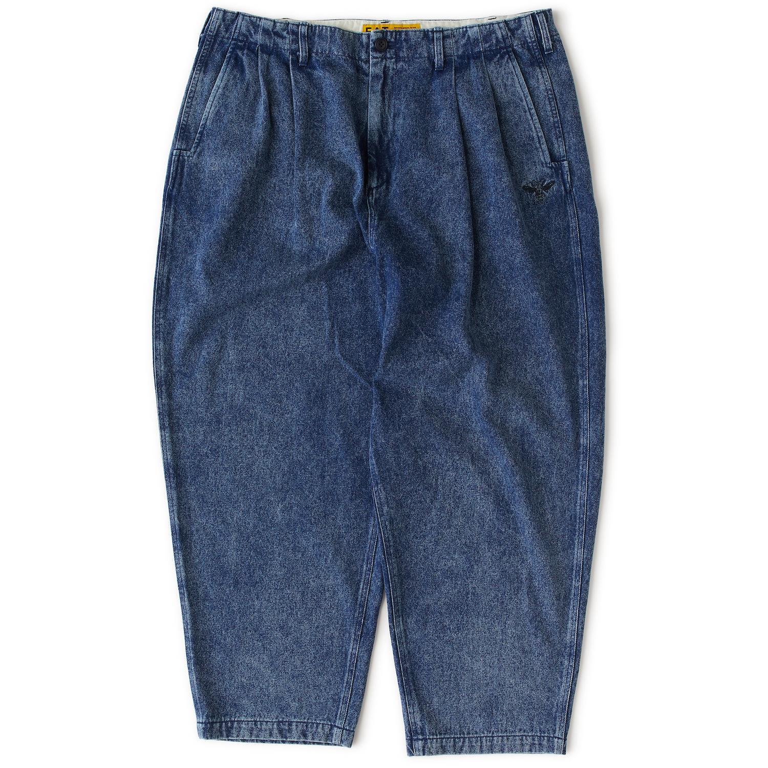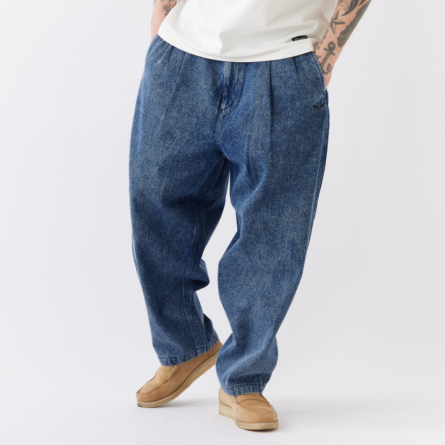 ケミカルウォッシュによる絶妙な色合いとアタリ感が印象的なデニムワイドパンツ。