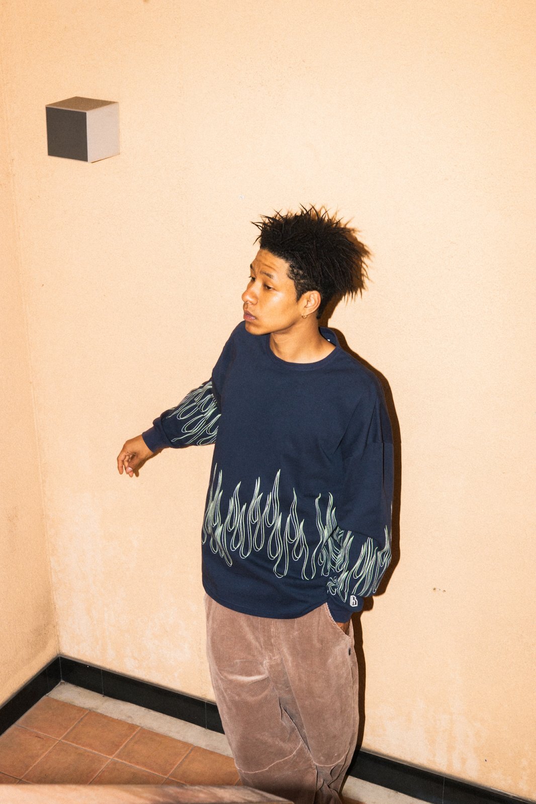 ピンストライプで構築された、重なり合うフレイムスが印象的なLS Tee。