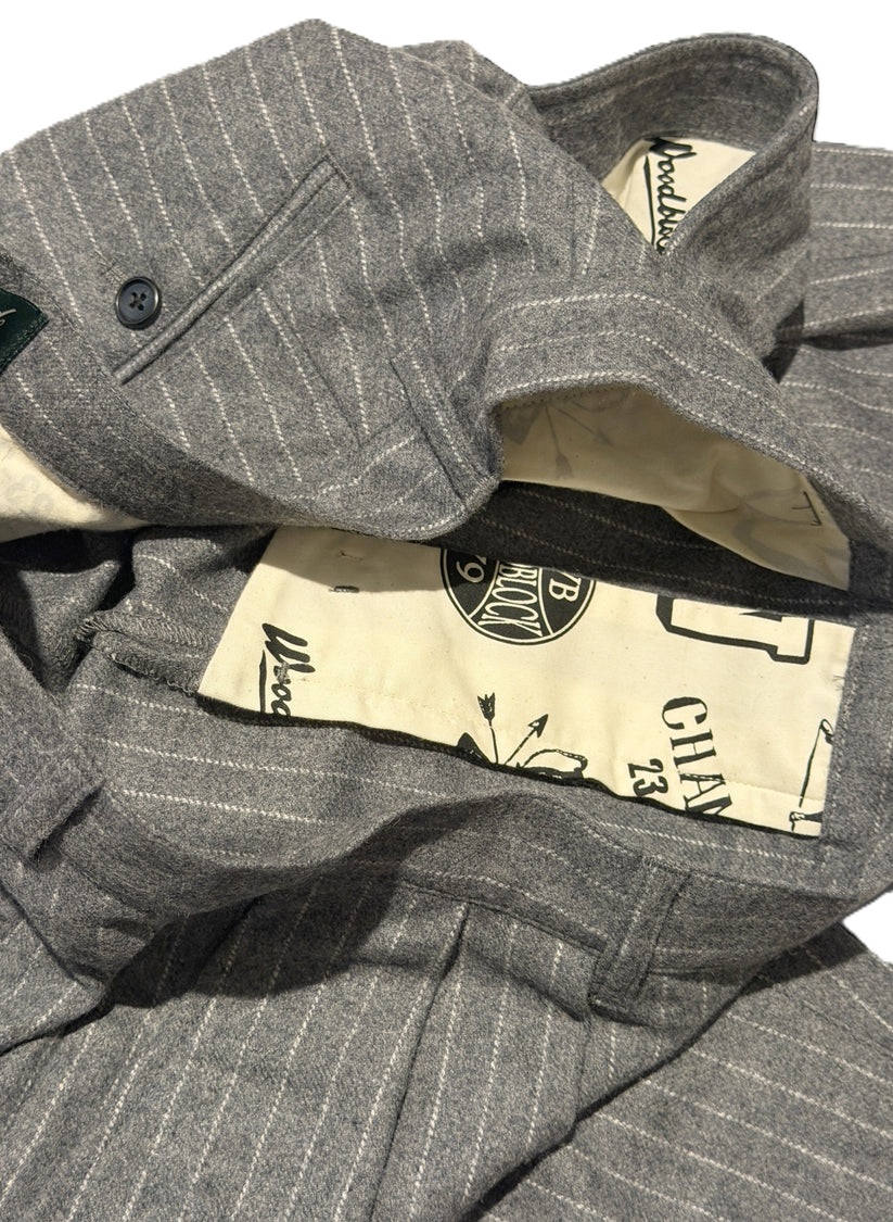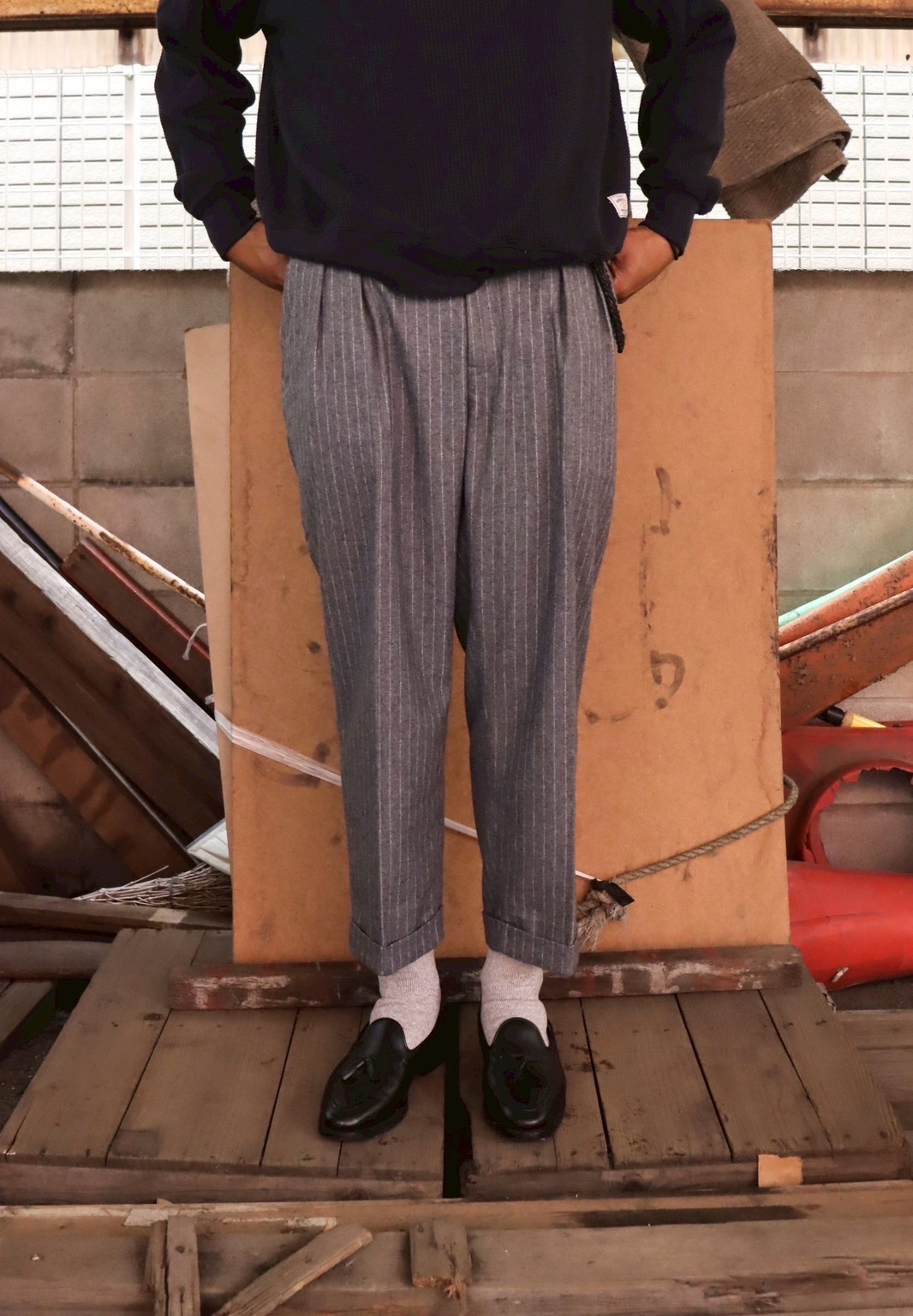 WOODBLOCK定番の2TUCK TROUSERを上質で肉厚なストライプのWOOL素材(WOOL50%、POLYESTEER 50%)で作成しました。