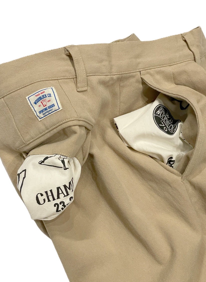 ポケットの内側には総柄プリントを施した生地を採用、ヒップポケット上のBRAND LABELなど一見シンプルながら、WOODBLOCKらしさも演出したデザイン。
